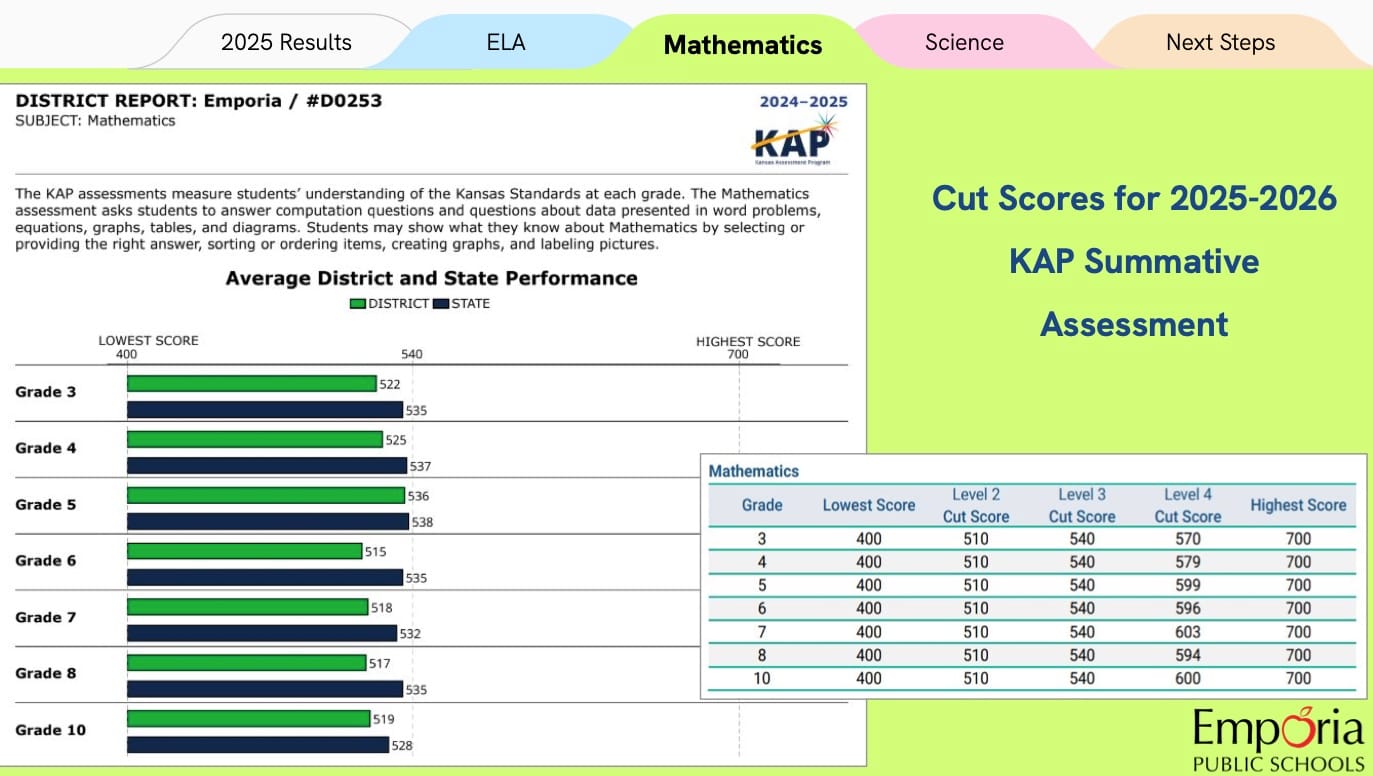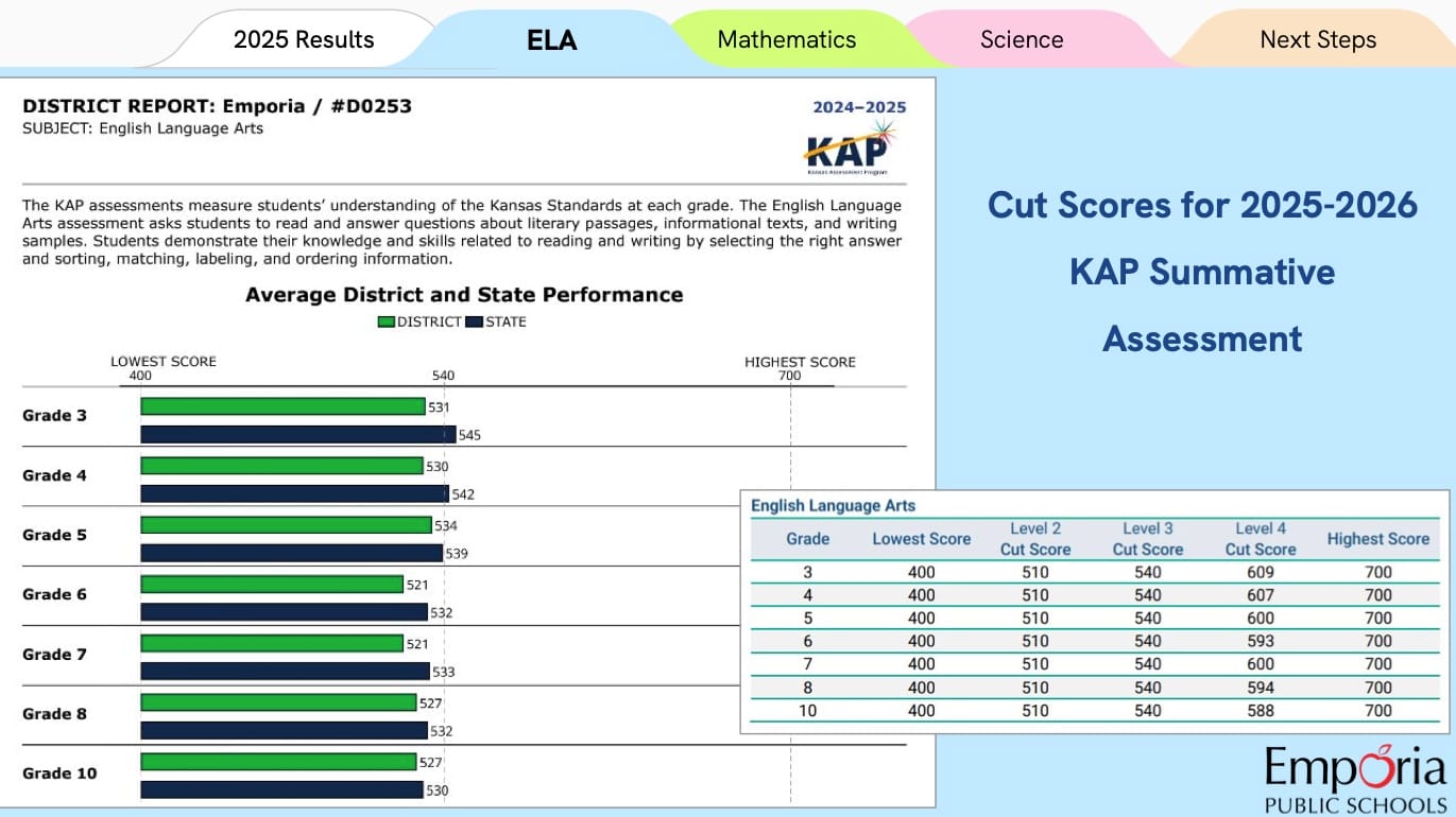 EMPORIA, Kan. - District officials presented the first look at the 2025 Kansas state assessment results, which were calculated using new proficiency standards set by the Kansas State Department of Education. According to the state agency, previous cut scores were misaligned with external indicators like ACT, AP/dual credit and postsecondary outcomes; the new scale is designed to be more accurate and comparable across grades. Emporia’s district-wide English language arts and math results were reported as close to the state average across most grade levels.
