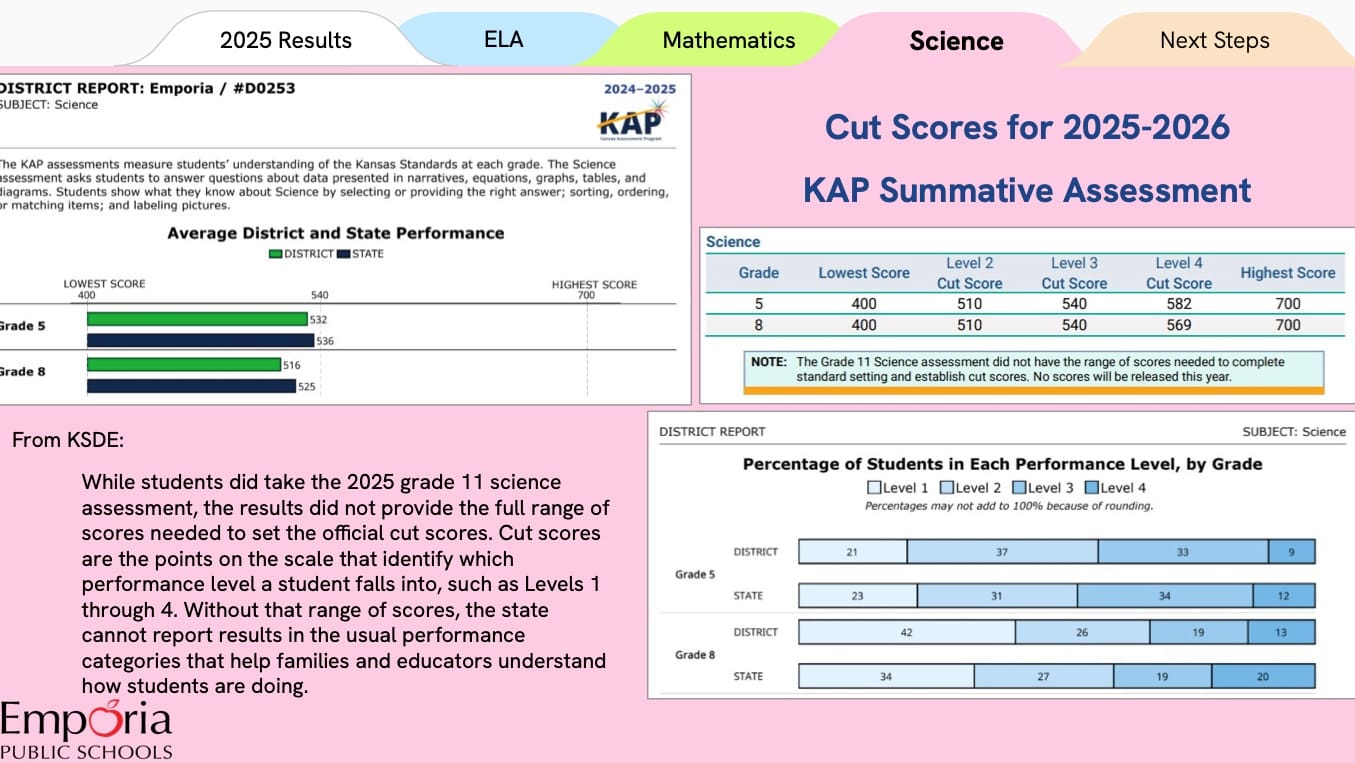 EMPORIA, Kan. - While the district reviewed assessment results for most subjects, scores for the 11th-grade state science assessment were not released by the Kansas State Department of Education. The Kansas Assessment Program announced the initial results did not provide the full range of scores needed to set official cut scores, so results will be realigned for next year.
