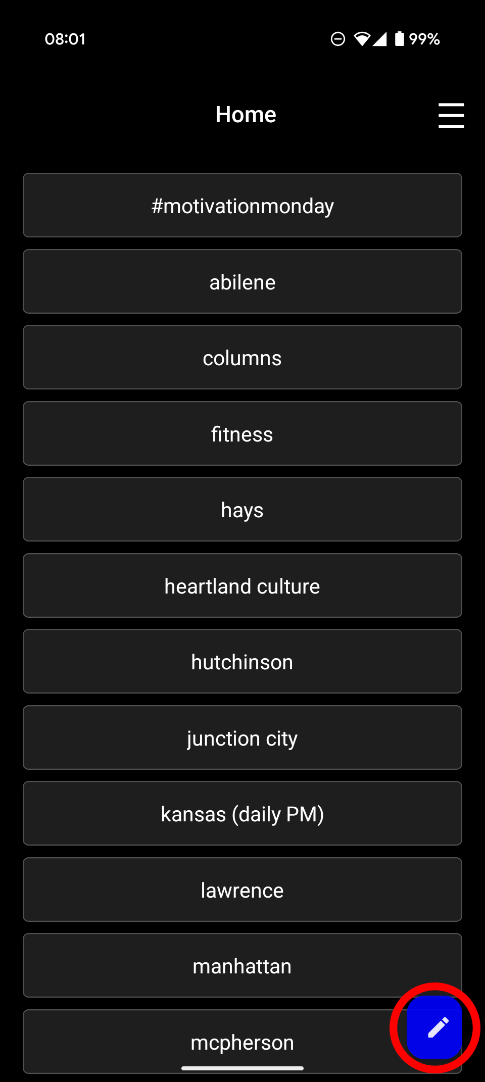 For all users, we now have a new button the menu screen. The blue button in the lower right hand corner allows you to toggle which cities appear on the home page. This does not affect which cities you receive notification for, and instead lets you declutter your home page, should you choose to do so.