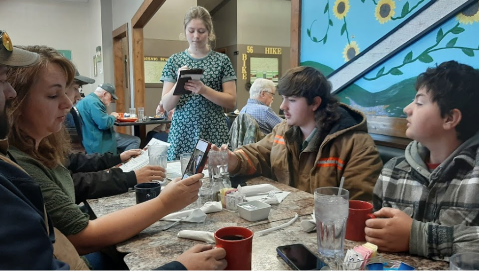 I visited 56 Family Restaurant in Galva, Kansas, on a clear Friday evening. The restaurant is located about six miles east of McPherson on Highway 56, a two-lane blacktop highway. The interior is decorated with various street signs and was emptier than normal due to home high school football games in both McPherson and Galva that night. The menu offers classic American diner fare, with hearty dishes that are sure to satisfy but will also clog your arteries. To wit, I ordered the country fried steak with bacon-wrapped asparagus and mashed potatoes. My mom opted for the walleye, a bold choice in central Kansas where the nearest body of water is the Marion Reservoir. We later found out the fish was flown in frozen from Canada daily. Dad went with the ribeye. The country fried steak was excellent, and I sampled both the ribeye and the walleye, which were equally tasty. I discarded my normally utilitarian dining habits and ordered the Rocky Road pie with a brownie crust for dessert. It did not disappoint. Guests could either pay by cash at the table or by credit card at the register. Our total came to $73.18. 56 Family Restaurant is a throwback to 1950s Americana, in the best possible sense.