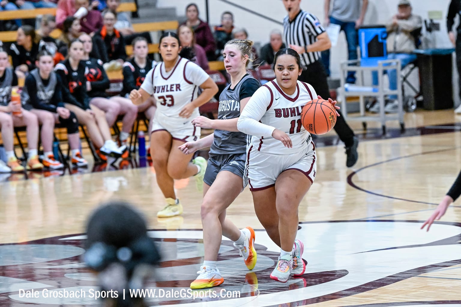 The game started slowly in what would be a low-scoring matchup. The Augusta Orioles took the lead early, finishing the first quarter with a score of 6-2 in their favor. They maintained a narrow advantage, leading 15-12 at halftime. The Buhler offense primarily operated from the perimeter, while the Orioles found success by consistently feeding the ball into the lane. Buhler junior Ella Voss and Augusta junior Chloe Wignall were standout players for their respective teams.