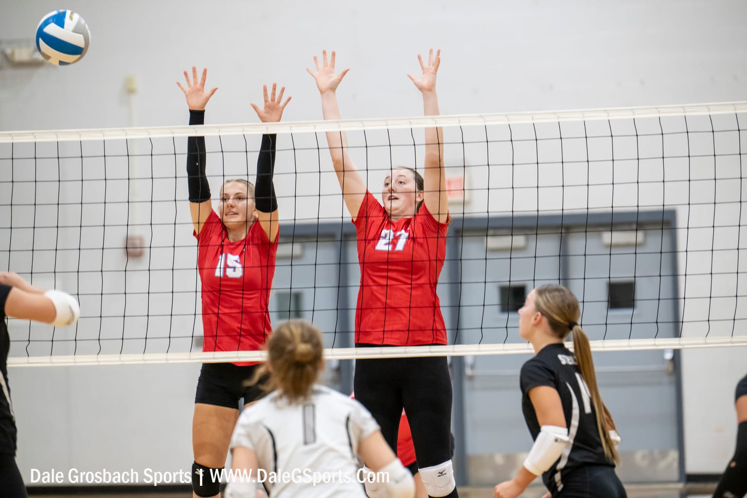 Junior Kara Nelson (#15) and freshman Azlyn Cost (#27) block an attack by the Sterling High School Black Bears. Freshman Azlyn Cost (#27) goes for the kill at the net against the Sterling High School Black Bears. Junior Eilley Cost (#3) attacks at the net against the Sterling High School Black Bears. Junior Kara Nelson (#15) and junior Eilley Cost (#3) complete the block against the Sterling High School Black Bears. Black Bears junior libero Tayla Hughes (#1) receives the serve against the Trinity Celtics. The Hutchinson Trinity Catholic Celtics were defeated by the Sterling Black Bears 2-0 and 2-0 on Sept. 16, 2025.