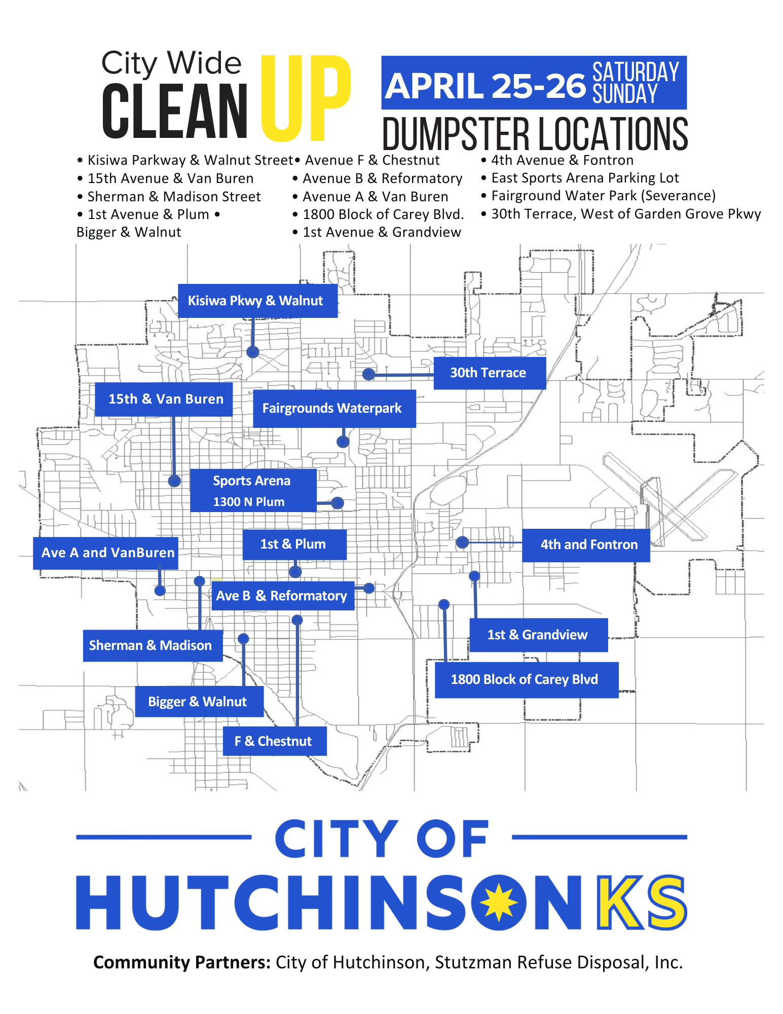 The City of Hutchinson will place dumpsters at 15 locations throughout the community free of charge to residents on April 25-26, a Saturday and Sunday, as part of its annual City Wide Cleanup event.