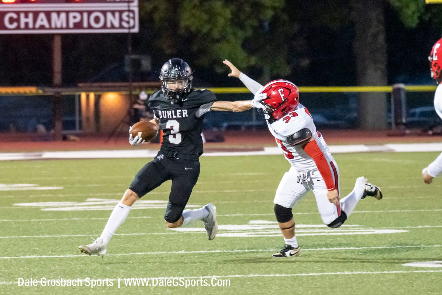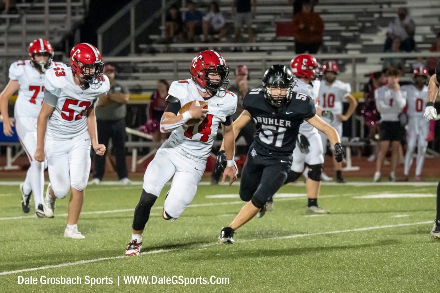 El Dorado's special teams continued to struggle. The ensuing punt traveled about 30 yards, and Buhler returned the ball to the Wildcat 8-yard line. Buhler senior tailback No. 22 Ben Clouse punched the ball into the end zone on the next play, scoring the first touchdown of the game.