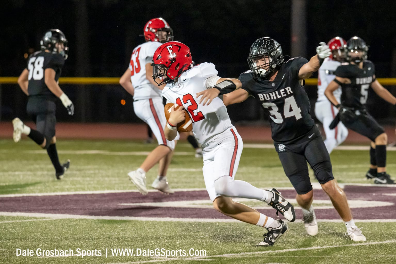 The second quarter mirrored the first. The Crusaders' defense forced two turnovers, while the offense added five touchdowns — three through the air, one on a run and one on an interception return. The half concluded with a commanding lead of 56-5 in favor of the Crusaders. The second half was played using the mercy rule running clock. The final score was 63-6 in favor of Buhler.