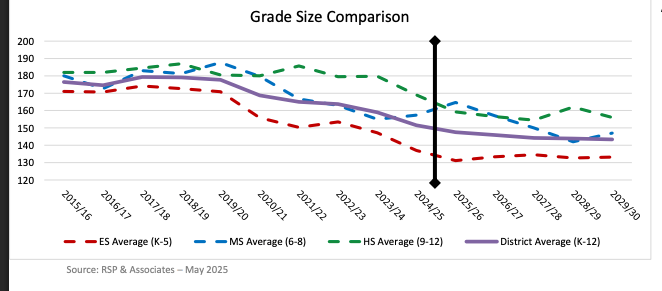 USD 418 enrollment peaked at 2,477 students in 2018-19. This year, it stands at 2,112—a loss of 365 students, or roughly 15 percent, in just six years. The decline has averaged 2.6 percent annually, and the RSP & Associates enrollment study commissioned by the district projects another 110-student drop by 2029-30. The pattern is stark at the classroom level: this year's kindergarten class enrolled just 109 students, while the graduating senior class numbered 182. When larger classes walk out the door each May and smaller ones walk in each August, the math moves in only one direction.
