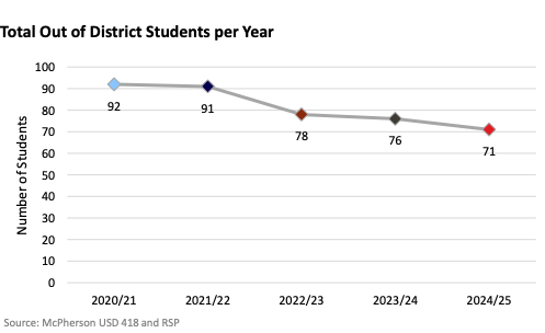 The transfer picture has shifted too. Three years ago, the district saw a net gain of 20 transfer students. That trend has reversed—the RSP study documents net losses in each of the last two years, with 33 more students leaving than arriving in 2024-25, choosing homeschool, virtual options, or neighboring districts. District officials acknowledge this outflow. I have a good friend whose son attended McPherson Middle School and then elected to attend Smoky Valley for high school rather than McPherson High School. Most people in town have similar stories.