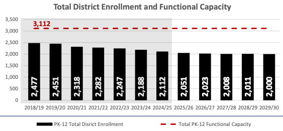 USD 418's six school buildings have a combined functional capacity of 3,112 students. Current enrollment of 2,112 means the district is operating at just 71 percent utilization—and falling. RSP recommends 85 to 90 percent utilization for efficient operation. Empty classrooms are not free—they still require heating, cooling, maintenance, and insurance.