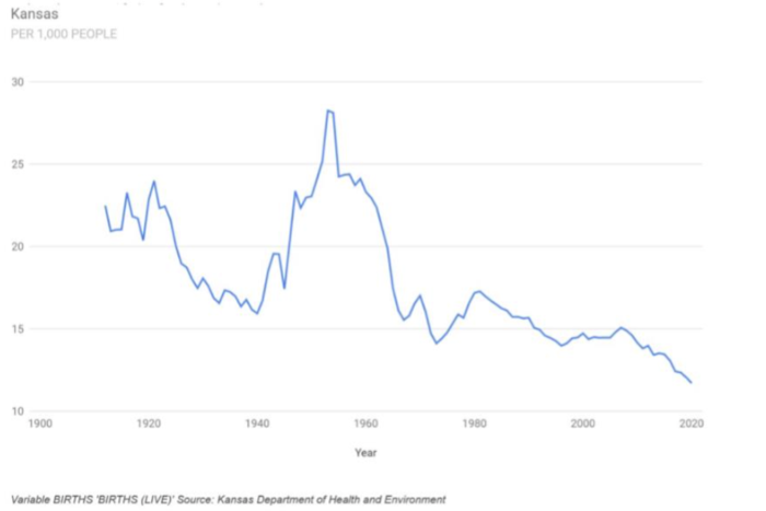 Kansas statewide public school enrollment has fallen roughly 16,000 students from its 2015 peak. Two-thirds of Kansas districts lost enrollment over the past five years. Nationally, public school enrollment peaked at 50.8 million in 2019 and is projected to drop to 46.9 million by 2031. The U.S. fertility rate hit a record low of 1.6 births per woman in 2023—well below the 2.1 replacement level. Kansas sits slightly above the national average at about 1.7, but the trend line points the same direction.