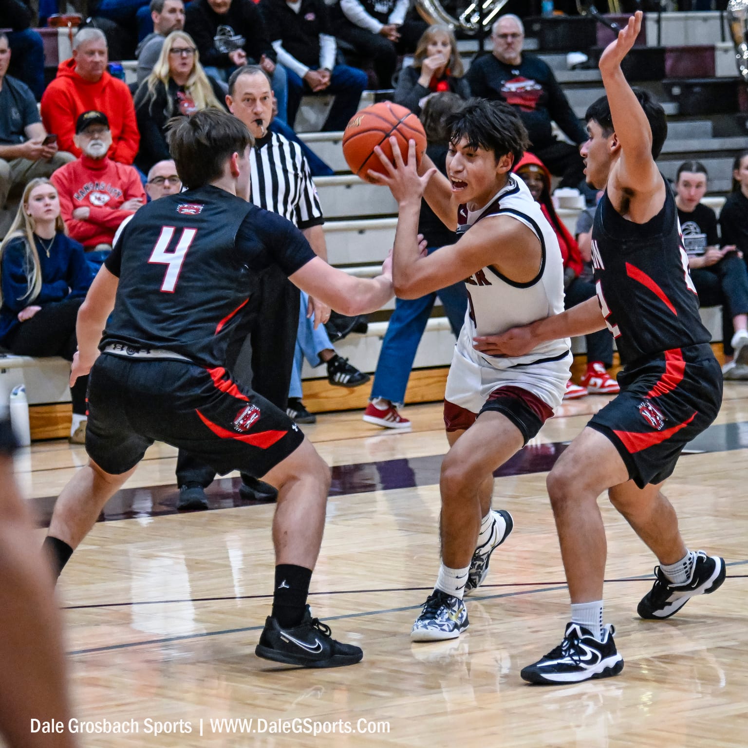 Crusader sophomore No. 3 Brycen McCurdy takes the ball into the paint for Buhler versus the Hesston Swathers. McCurdy led the scoring for Buhler with 14 points.