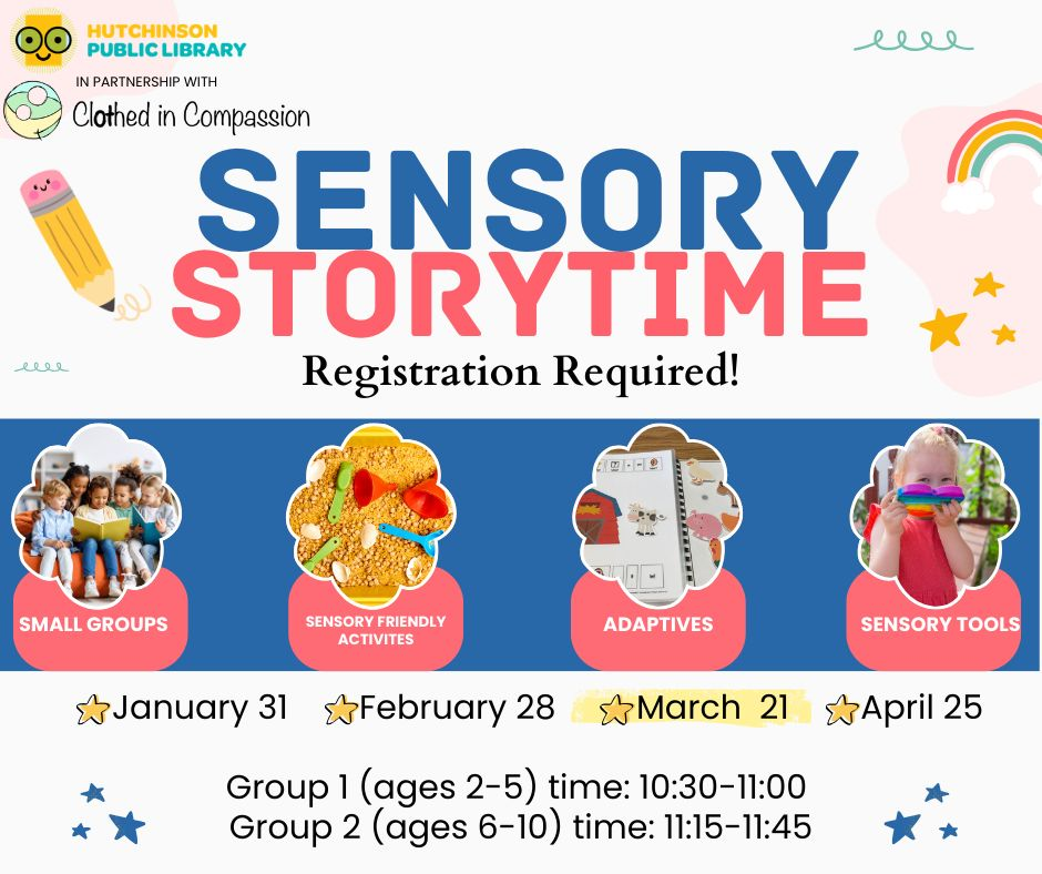 HUTCHINSON, Kan. — The Hutchinson Public Library, in partnership with Clothed in Compassion, is hosting a Sensory Storytime series designed for children with varying sensory needs, with the next session scheduled for Saturday, March 21.