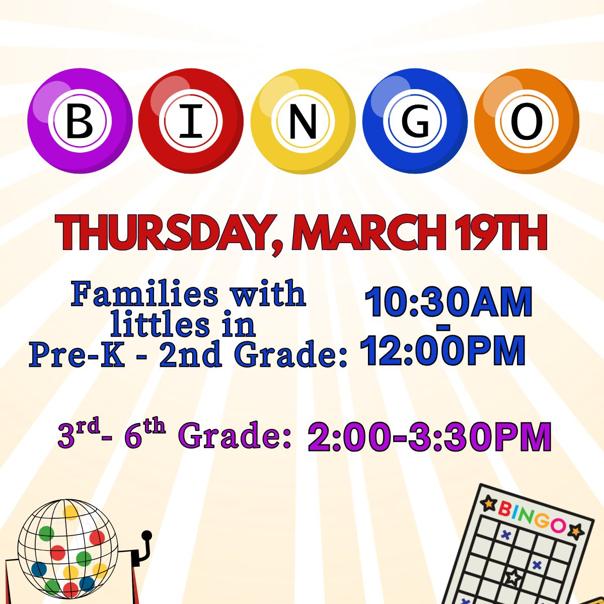 Families with children in pre-kindergarten through second grade may attend at 10:30 a.m. or noon. Students in third through sixth grade are invited to a session from 2 to 3:30 p.m.
