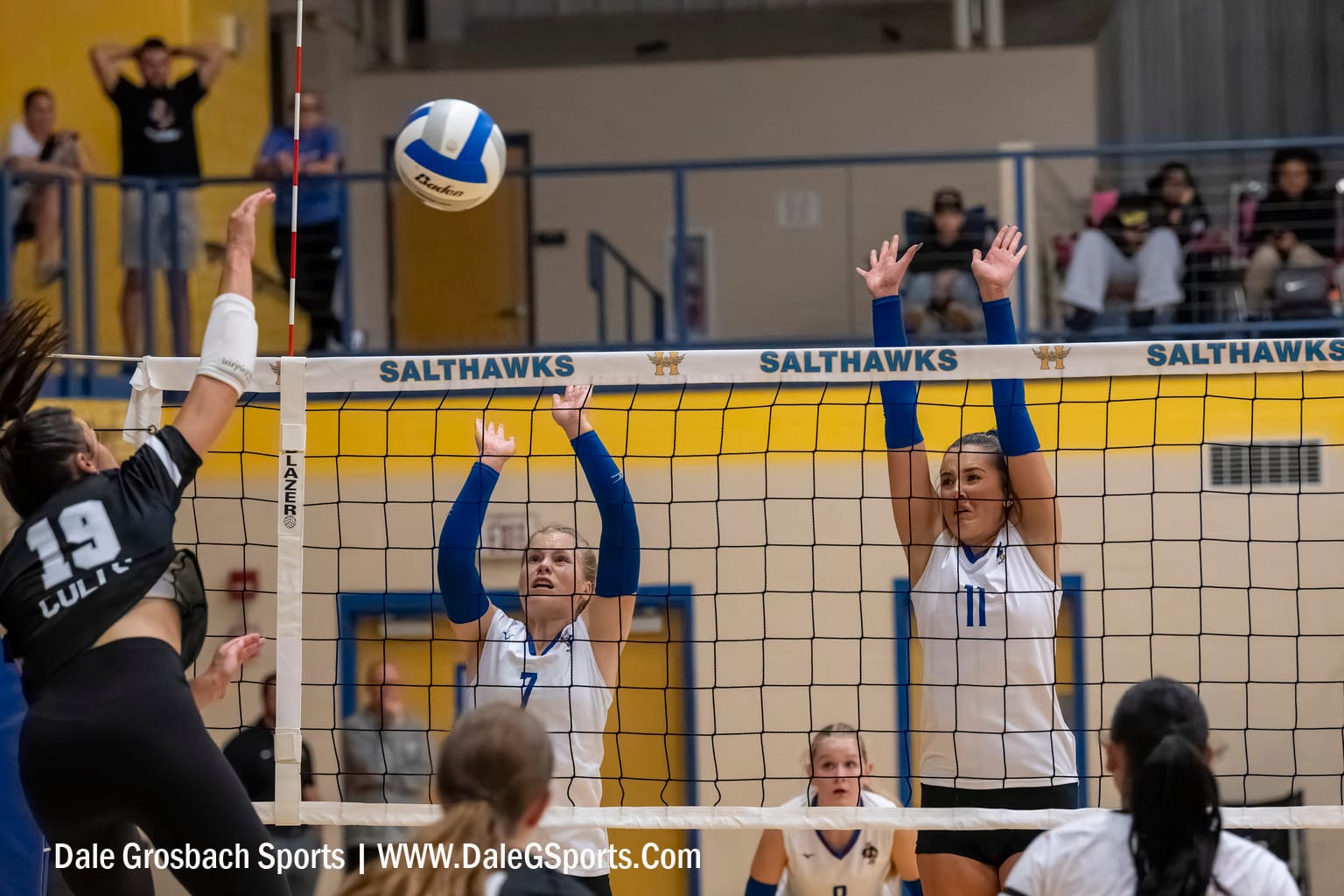 Sophomore outside hitter No. 7 Annalee Eckhoff and senior middle blocker No. 11 Bryten Ashcraft rise to block the Haysville Campus High School Colts. The Hutchinson Salthawks defeated the Colts 2-0 on Sept. 9, 2025.Senior setter No. 8 Myka Thompson blocks against the Haysville Campus High School Colts. The Hutchinson Salthawks defeated the Colts 2-0 on Sept. 9, 2025.Senior middle blocker No. 11 Bryten Ashcraft attacks at the net against the Haysville Campus High School Colts. The Hutchinson Salthawks defeated the Colts 2-0 on Sept. 9, 2025.