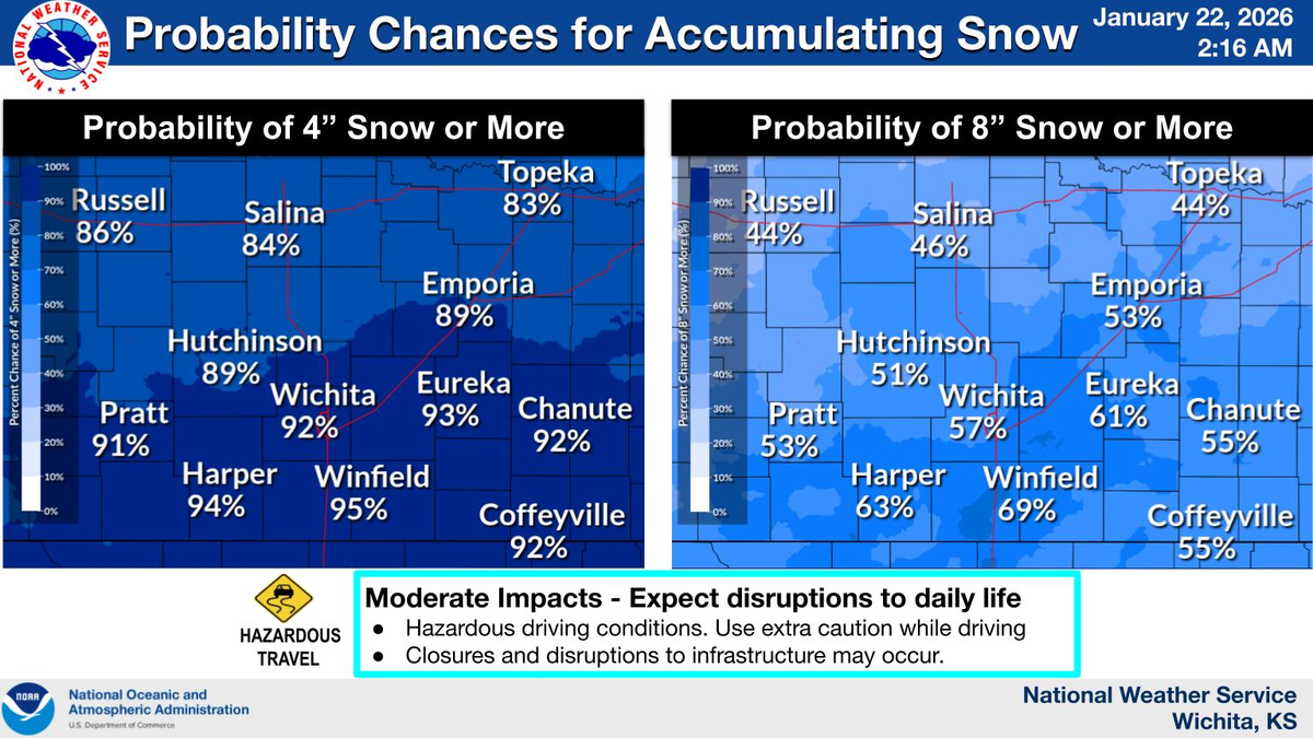 - Arctic Storm: A winter storm will dump 4-8 inches of snow across Kansas Friday through Saturday, with life-threatening wind chills as low as -22°F that could cause frostbite in 30 minutes.