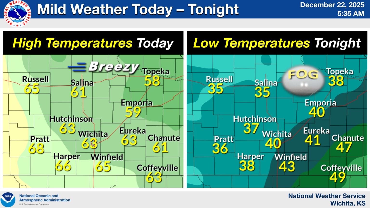 - Unusual warm spell will push Kansas Christmas temperatures into the 70s, potentially breaking records before a weekend cold front returns temps to normal 40s-50s range.