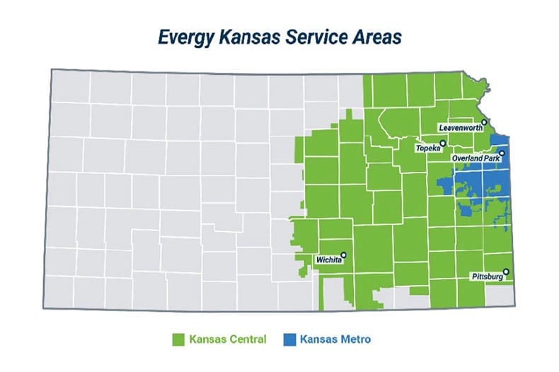 Evergy serves 1.7 million customers across Kansas and Missouri through four service areas, two in each state. The utility company, headquartered in Kansas City with a major administrative office in Topeka, emerged from the 2018 merger of Westar Energy and Great Plains Energy's Kansas City Power & Light. Its territory covers roughly 28,000 square miles in eastern Kansas and western Missouri.