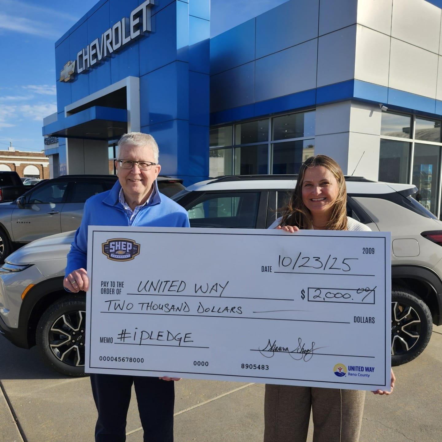 RENO COUNTY, Kan. — Shep Chevrolet has delivered a $2,000 donation to United Way of Reno County, completing a year-long commitment to donate $10 for every vehicle sold at the dealership.