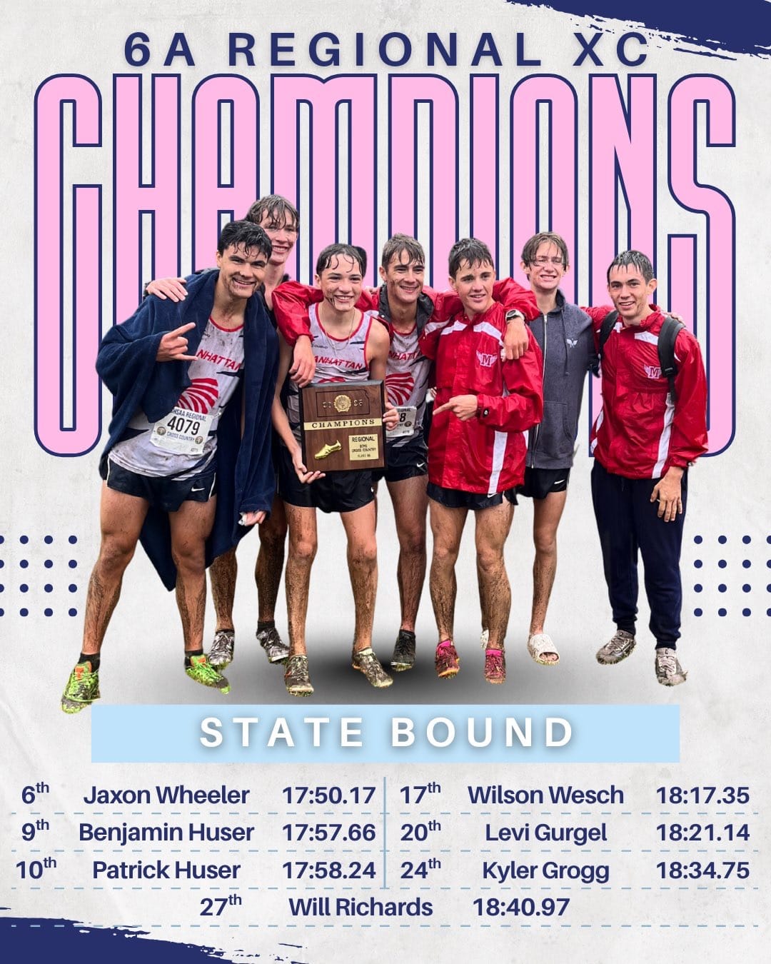 Manhattan's girls and boys cross country teams are heading to Lawrence after claiming Regional Championships in Wichita on Saturday. Both squads will compete at the state meet on Saturday, November 1st, at Rim Rock Farm, with the girls racing at 10:35 a.m. and the boys taking the course at 12:20 p.m.
