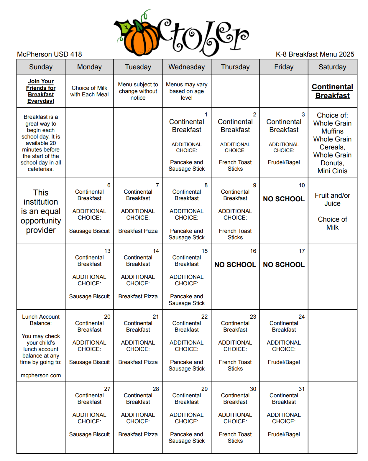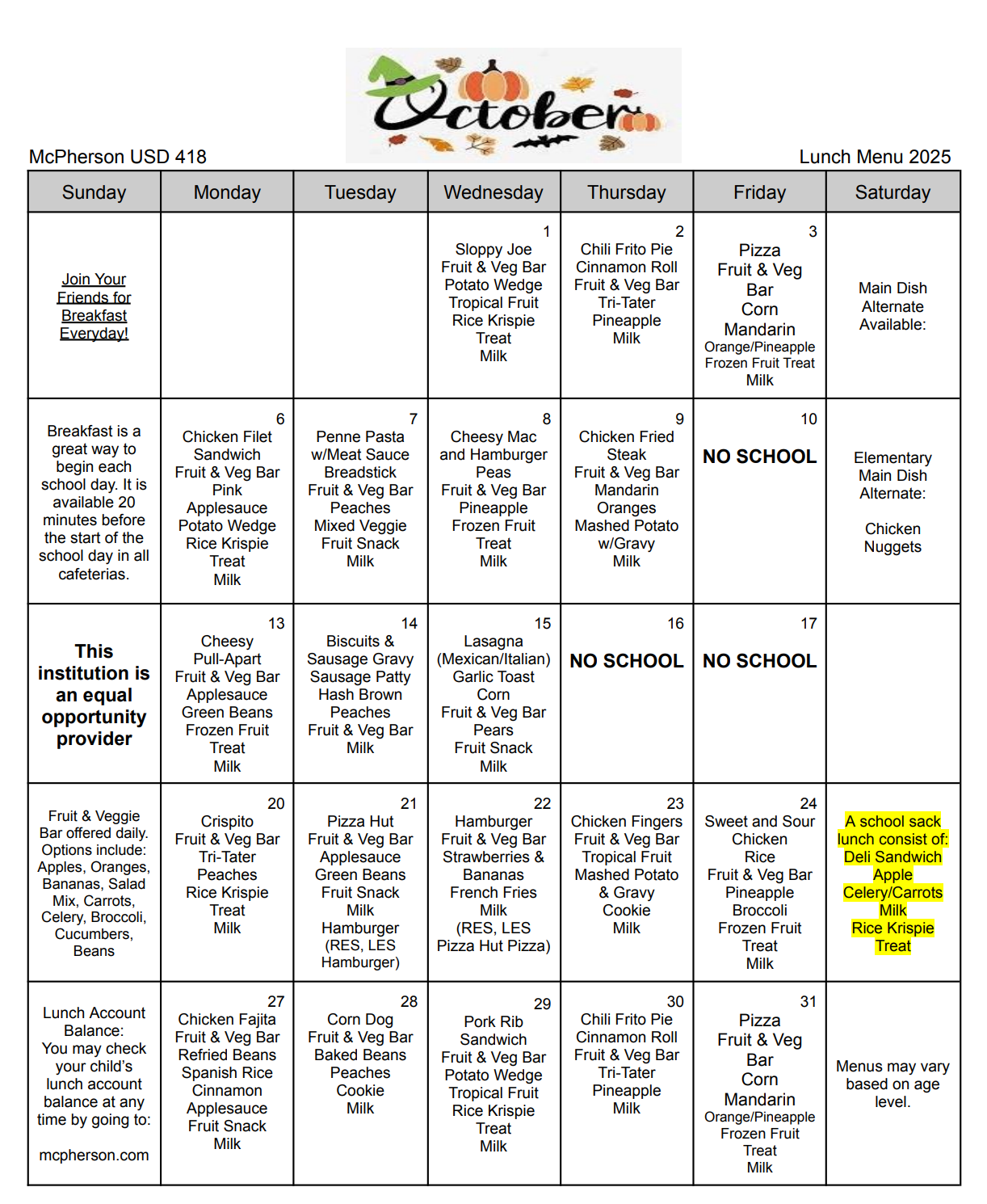 McPherson USD 418 has released its breakfast and lunch menus for October 2025