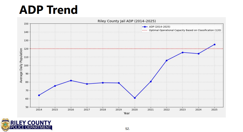 Average daily inmate population at the Riley County Jail has climbed to 131 as of mid-August, up from about 77 in 2015, according to a presentation by Riley County Police Department leadership. The jail has 147 beds but an operational capacity of only 120, meaning it is currently operating well beyond its designed limits.
