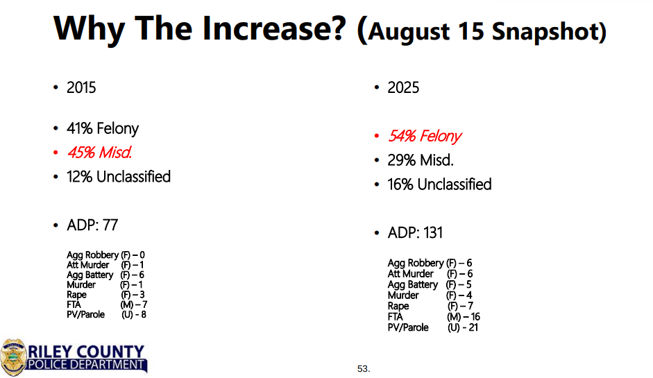 The surge is being driven not by an increase in overall crime — which remains low in Riley County — but by a spike in felony charges, failures to appear in court and parole violations. An August snapshot showed felony cases jumped to 54% of the inmate population from 41% in 2015, while misdemeanor cases fell to 29% from 45%.