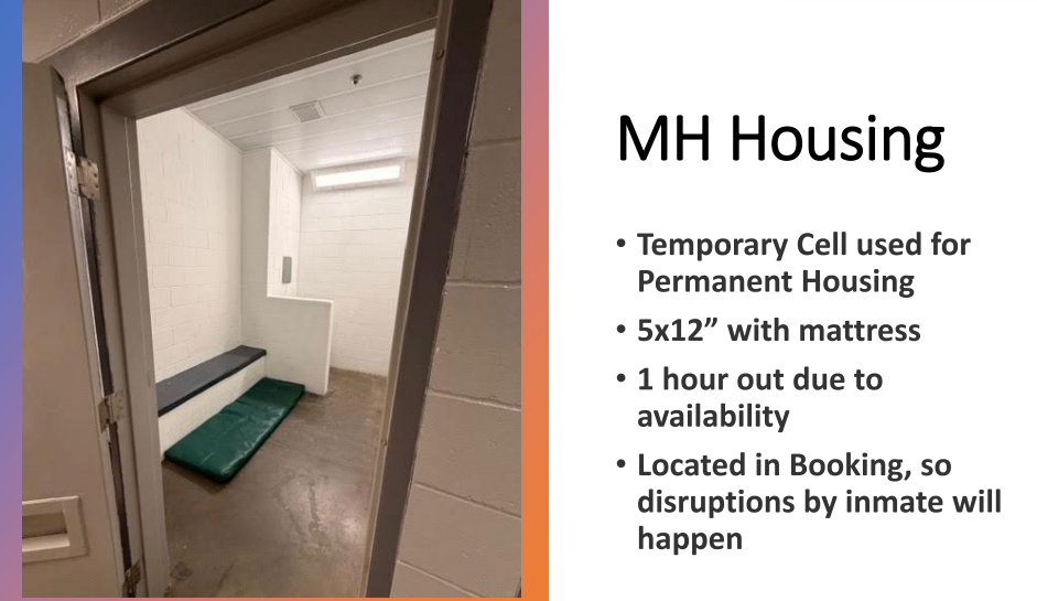 Mental health has emerged as a critical underlying issue. Nearly 40% of inmates currently take mental health medication, straining a facility never designed for such specialized needs. Some inmates are housed in temporary holding cells that were meant for short-term use but have become long-term housing due to lack of space.