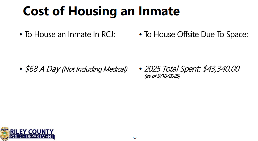 Despite the jail's capacity crisis, the Riley County Police Department reported overall crime remains low and is trending lower than the five-year average. Property crime was down 41% compared to the same month last year, and violent crime remains relatively stable, according to a crime report presented to the board.