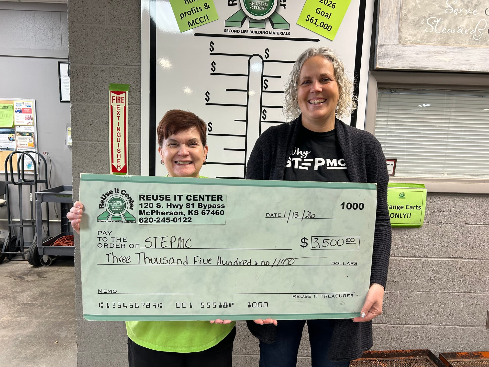 STEPMC, which works to walk alongside people until they are out of poverty, received a donation. The organization provides a framework for building relationships across economic and class lines, fostering connections and creating pathways of opportunity for those in need. Executive Director Angie Brunk accepted the donation alongside ReUse It Center volunteer Kathy Berry.