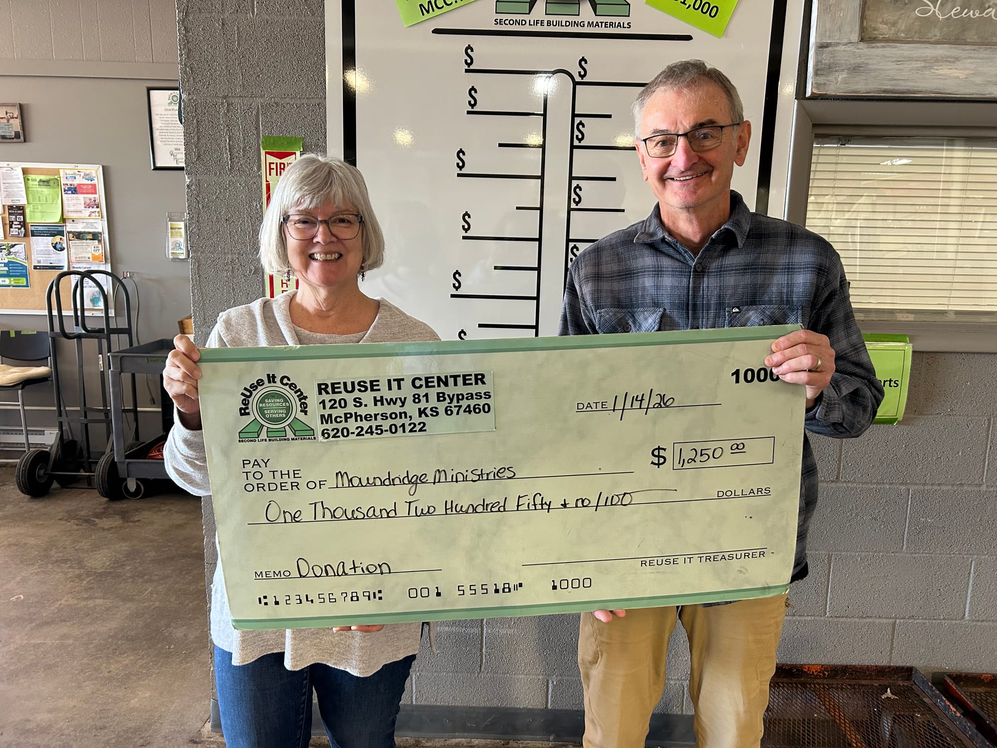 Associated Ministries of Moundridge, which coordinates Christian outreach and community action among area churches, also received funds. The organization oversees ministries including Angel's Attic, Cradle to Crayons, Moundridge Food Pantry, Moundridge Senior Center and Helping Hands of Moundridge. Rick Krehbiel represented the organization, with ReUse It Center board secretary Dot Janzen presenting the donation.