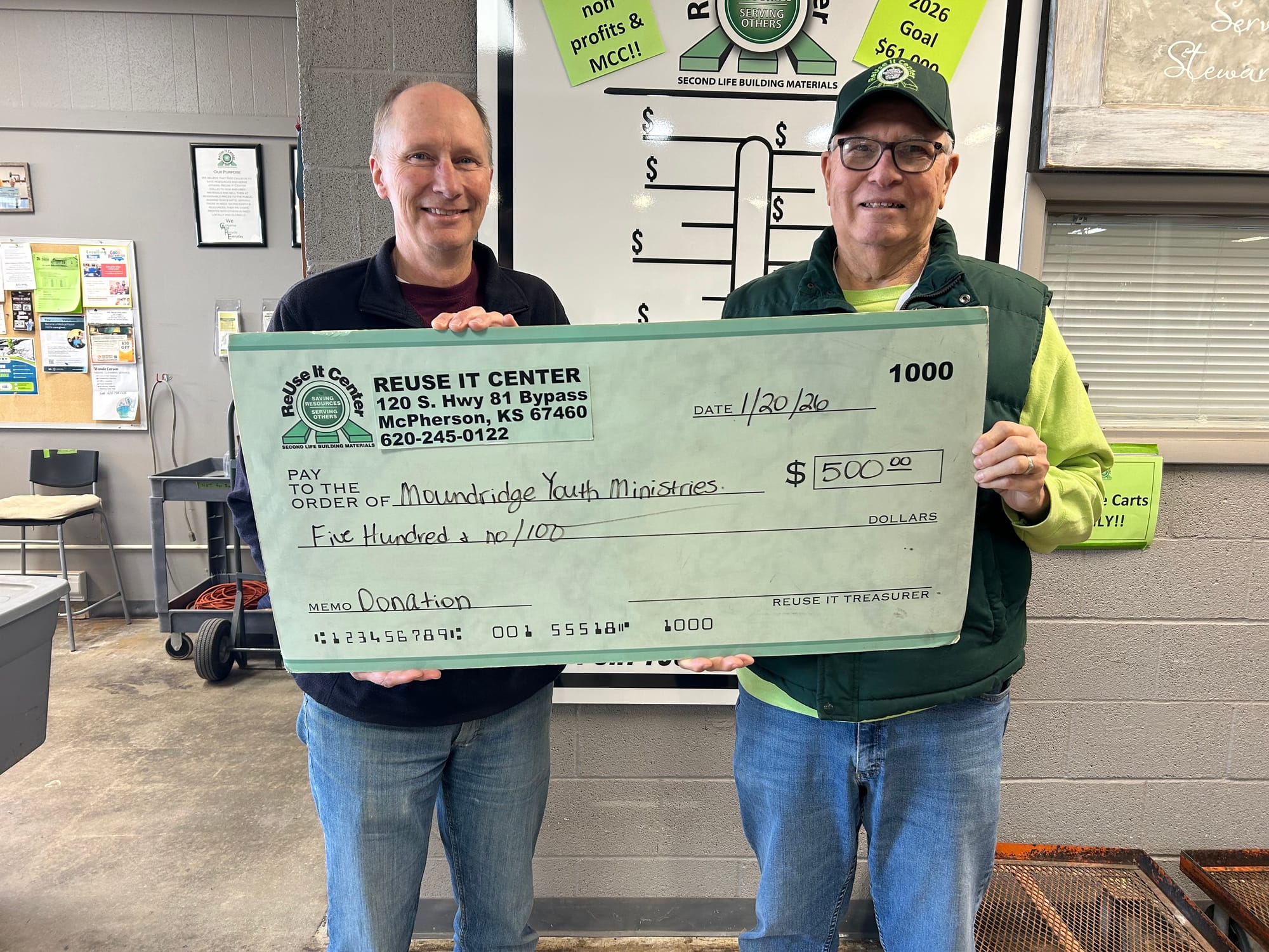 Moundridge Youth Ministries, a K-8 program that has served area youth for 16 years, rounded out the January distributions. The program provides meals, Christian programming with music and art, and hands-on servant leadership lessons. Dwight Suderman accepted the donation on behalf of MYM from ReUse It Center volunteer Danny Glidewell.