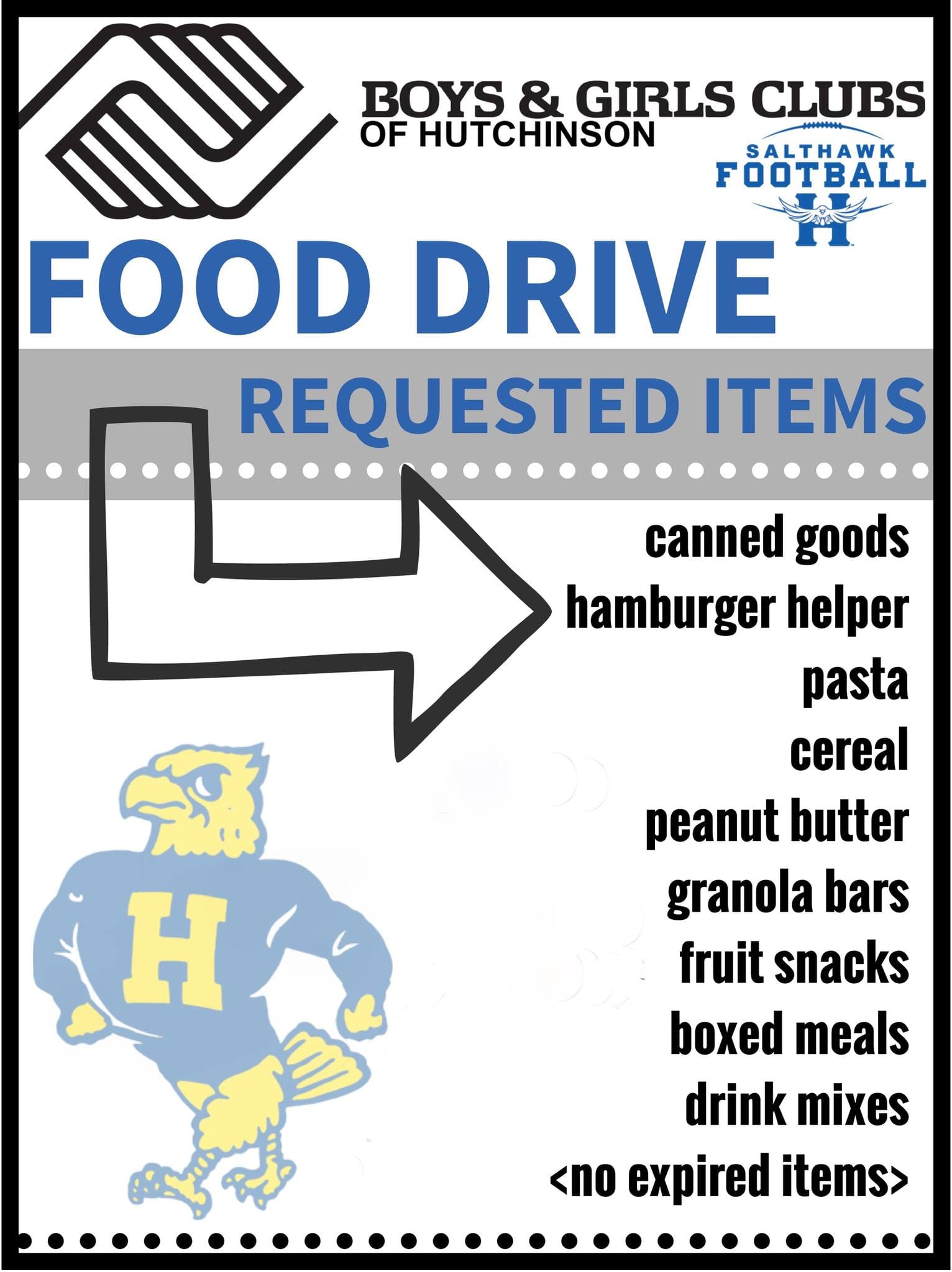 HUTCHINSON, Kan. — Salthawk Football is partnering with the Boys & Girls Clubs of Hutchinson for a food drive during the team's final home game of the regular season Friday, Oct. 24.