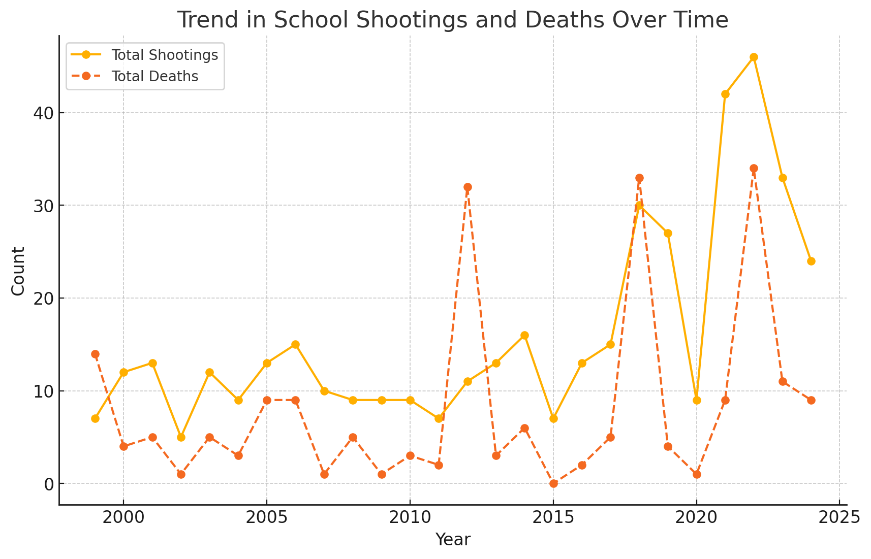 Ed note: The frequency of school shootings has surged in recent years, particularly during the late 2010s and early 2020s. While it may seem impersonal to apply statistics to such devastating events, analyzing these numbers is crucial to understanding the scope of this ongoing crisis. In 2024, there have already been 24 school shootings, resulting in 9 deaths. This is slightly lower than 2023, which saw 11 deaths, but the overall trend remains concerning. In 2022, the number of deaths spiked significantly, with 34 lives lost—three times higher than the five-year average of 11.8 deaths from 2019 to 2023. The data also reveals an increasing number of shootings over time. While the 2000s saw relatively fewer incidents, the past decade has seen a marked rise in both shootings and fatalities. The average number of school shootings from 2019 to 2023 was 35.6 per year, compared to lower annual figures in the early 2000s.