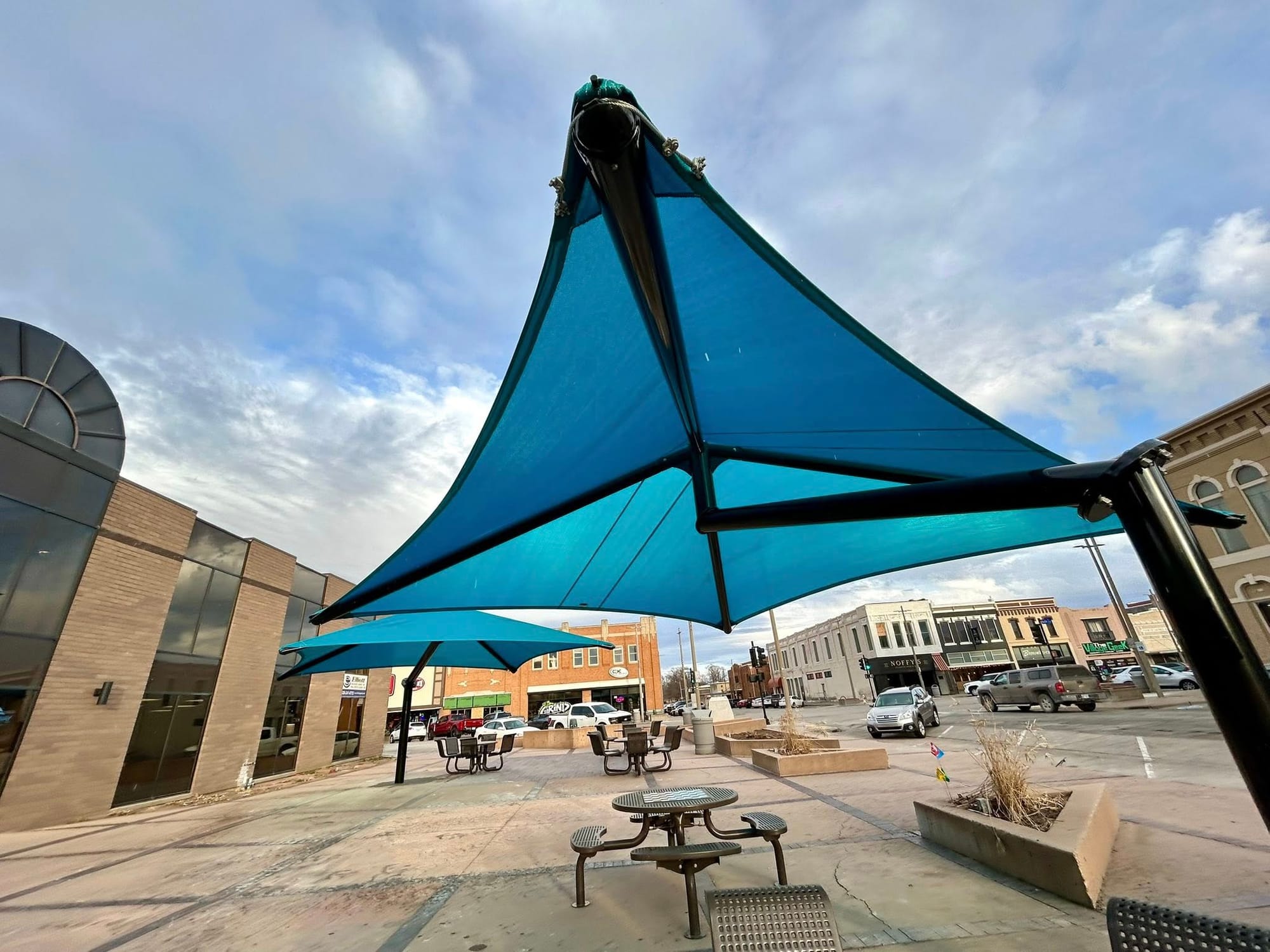 MCPHERSON, Kan. — Permanent shade structures have been completed at The Plaza downtown gathering space at Main and Marlin, providing cover for both the stage area and adjacent seating through a community-funded project approved by the City Commission last October. The installation by Happy Playgrounds was made possible through $23,000 in private donations channeled through the McPherson County Community Foundation, including a contribution from residents Sid and Wendy Johnson for the stage covering, while McPherson Main Street funded the remaining costs for table and seating area shade with assistance from a McPherson Rotary Club grant.