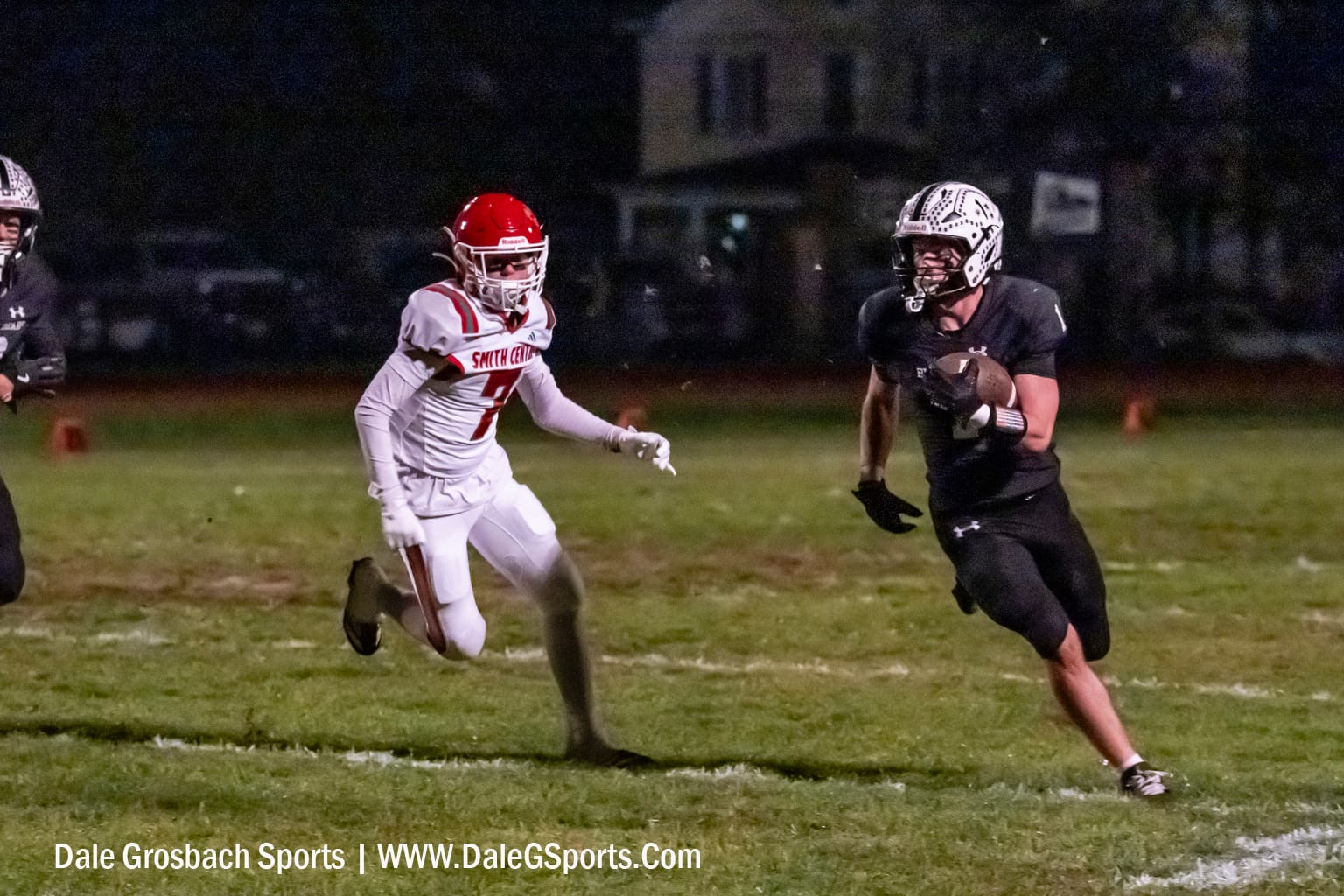 The second half continued with a heavy emphasis on the run and strong defensive play. Smith Center had the ball first, but its second turnover, a fumble following a pass reception, hampered its efforts. The Sterling offense was unable to gain sufficient yardage on the ensuing series, being forced to go three-and-out. However, Smith Center fumbled for a third time during its subsequent possession.