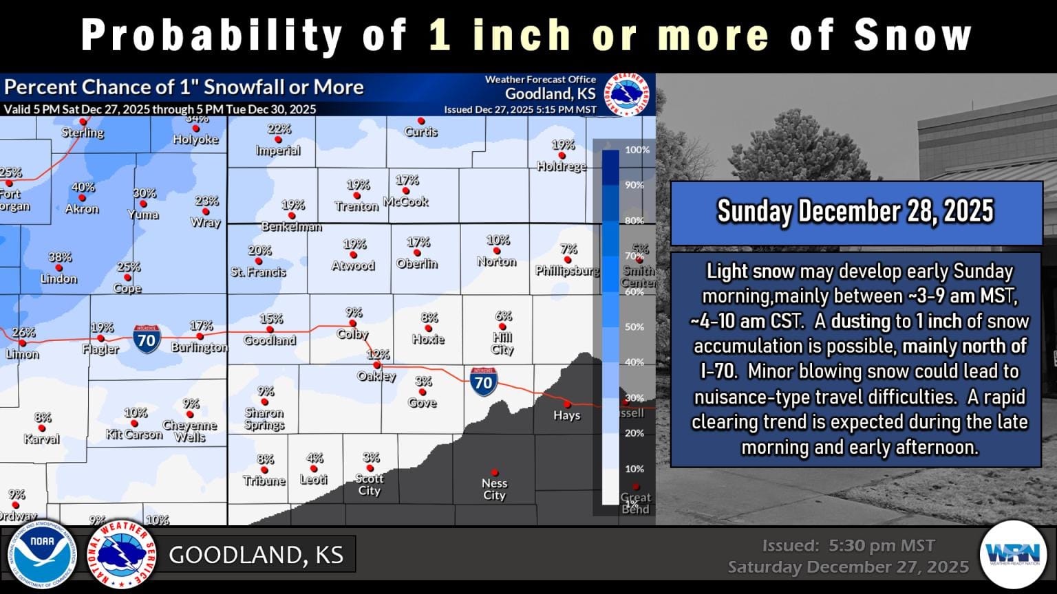 Kansas residents should brace for powerful winds through Sunday afternoon, with the National Weather Service issuing wind advisories across much of the state. Wind advisories remain in effect until 4 p.m. CST for north-central, northeast and east-central Kansas. Residents are urged to secure loose outdoor items, including holiday decorations and trash containers, and exercise caution when driving, particularly in high-profile vehicles. Light snow may develop early Sunday morning in northwest Kansas, mainly between 4-10 a.m. CST, with a dusting to 1 inch of accumulation possible north of Interstate 70. Minor blowing snow could create nuisance travel difficulties before conditions improve by late morning.