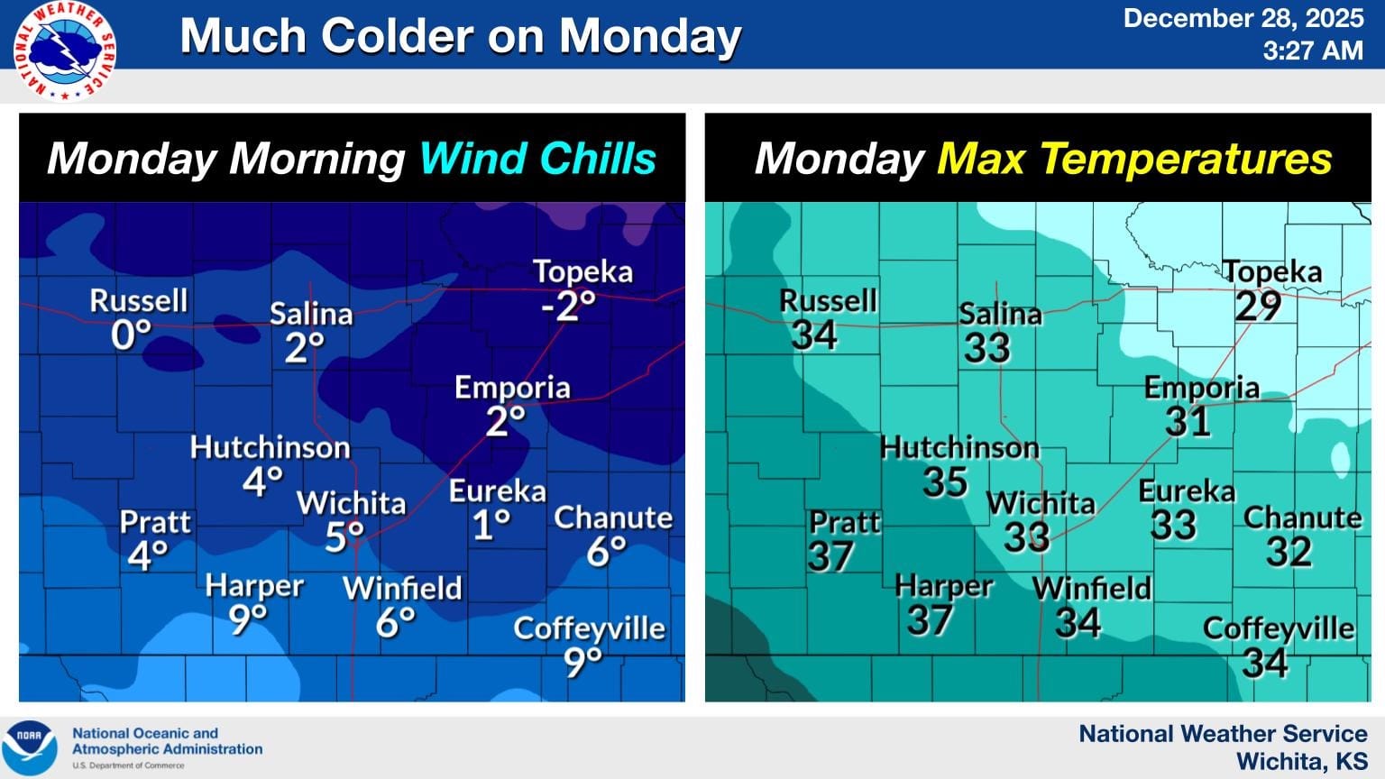 Much colder air will blast into Kansas overnight, bringing dangerously low wind chills Monday morning. Wind chill values will range from zero to 9 degrees across the state, with the coldest readings in northwest Kansas. High temperatures Monday will struggle to reach the low-to-mid 30s across central and southern Kansas, with areas near Topeka only reaching 29 degrees. T