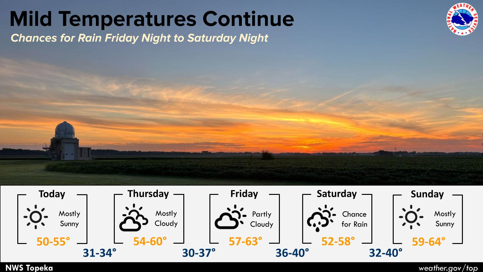 - Expect a mix of sun and clouds today with a high of 53°F and calm winds, though you'll want a heavy coat tonight as temperatures dip to a chilly 22°F.
