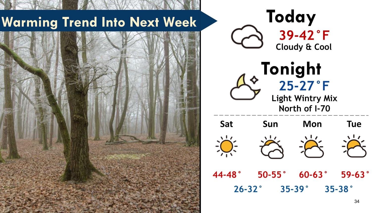 - Cloudy today with highs near 37°F; watch for patchy freezing fog developing as temperatures drop to 26°F overnight.
