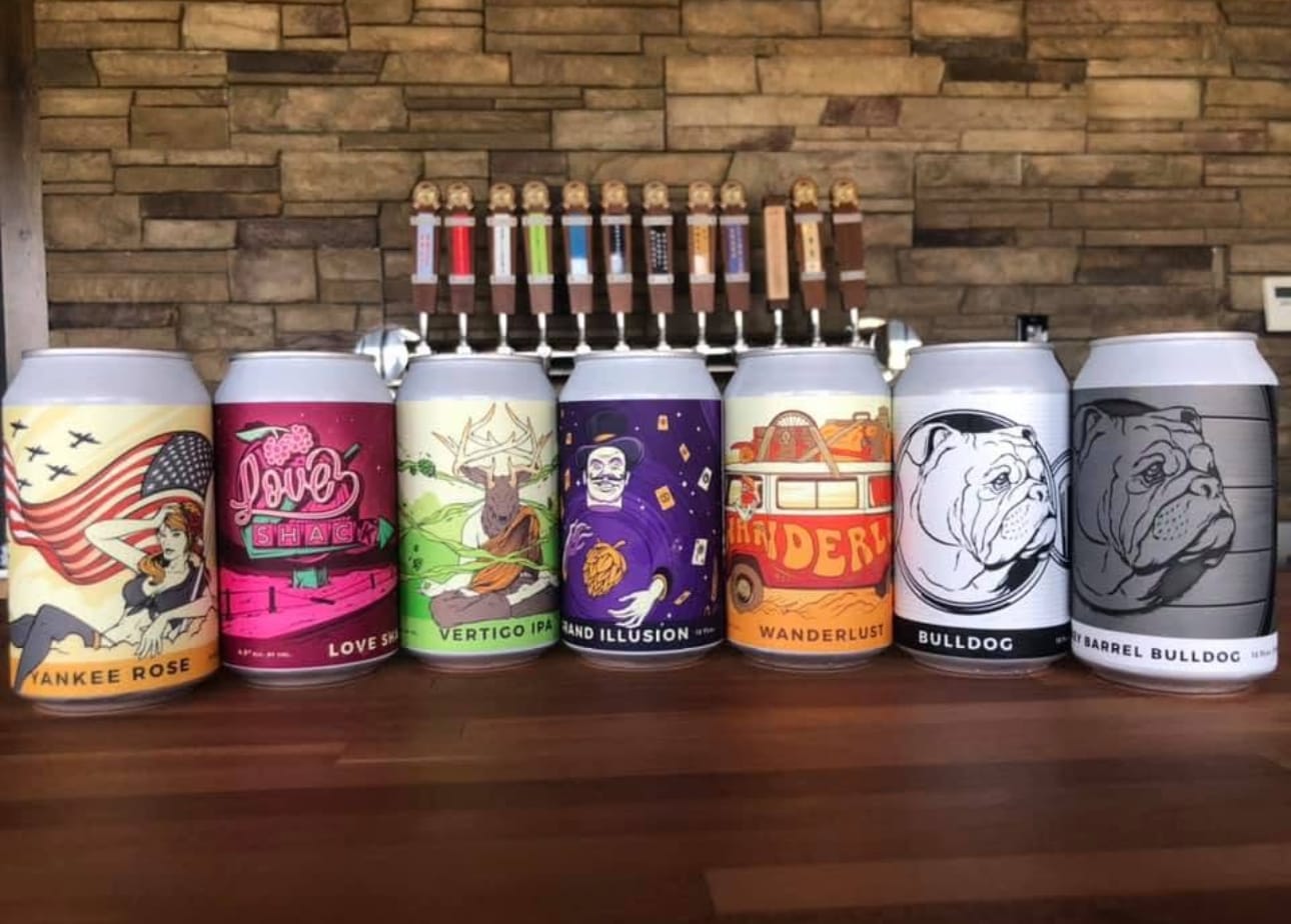 The brewery's 12-tap system typically features at least 10 house-made beers, with their World War II-themed "Yankee Rose" drawing crowds to the taproom while their "Vertigo" IPA dominates liquor store sales across central Kansas. The operation has grown to include statewide distribution, with six-pack cans rolling off their in-house canning line for pickup by distributors.