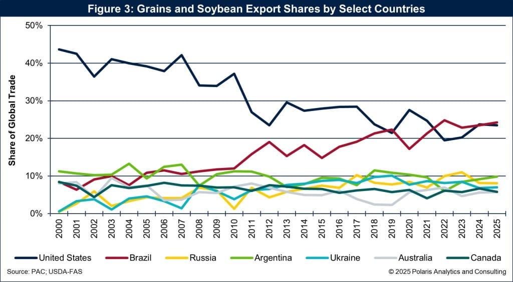 Farmers across the High Plains and United States harvested a record 23.6 billion bushels for the 2025-26 marketing year, an 8% increase from last year, with corn leading the surge at 16.7 billion bushels—up 12% from 2024-25. Soybeans dropped 3% to 4.3 billion bushels while wheat remained steady near 2 billion bushels, with final production figures due January 12 in the USDA's Crop Production Annual Summary. The abundant supplies will easily satisfy domestic consumption projected at a record 17.4 billion bushels, up 5%, while leaving substantial surplus for export markets. Since 2000, production has exceeded consumption in 14 years including 2025, creating downward pressure on commodity prices as U.S. global market share has declined from over 40% in the early 2000s to approximately 25% today, matching Brazil's expanding presence. Despite shrinking export share, the domestic market remains robust as ethanol demand for corn and renewable diesel from soybean oil continue expanding.