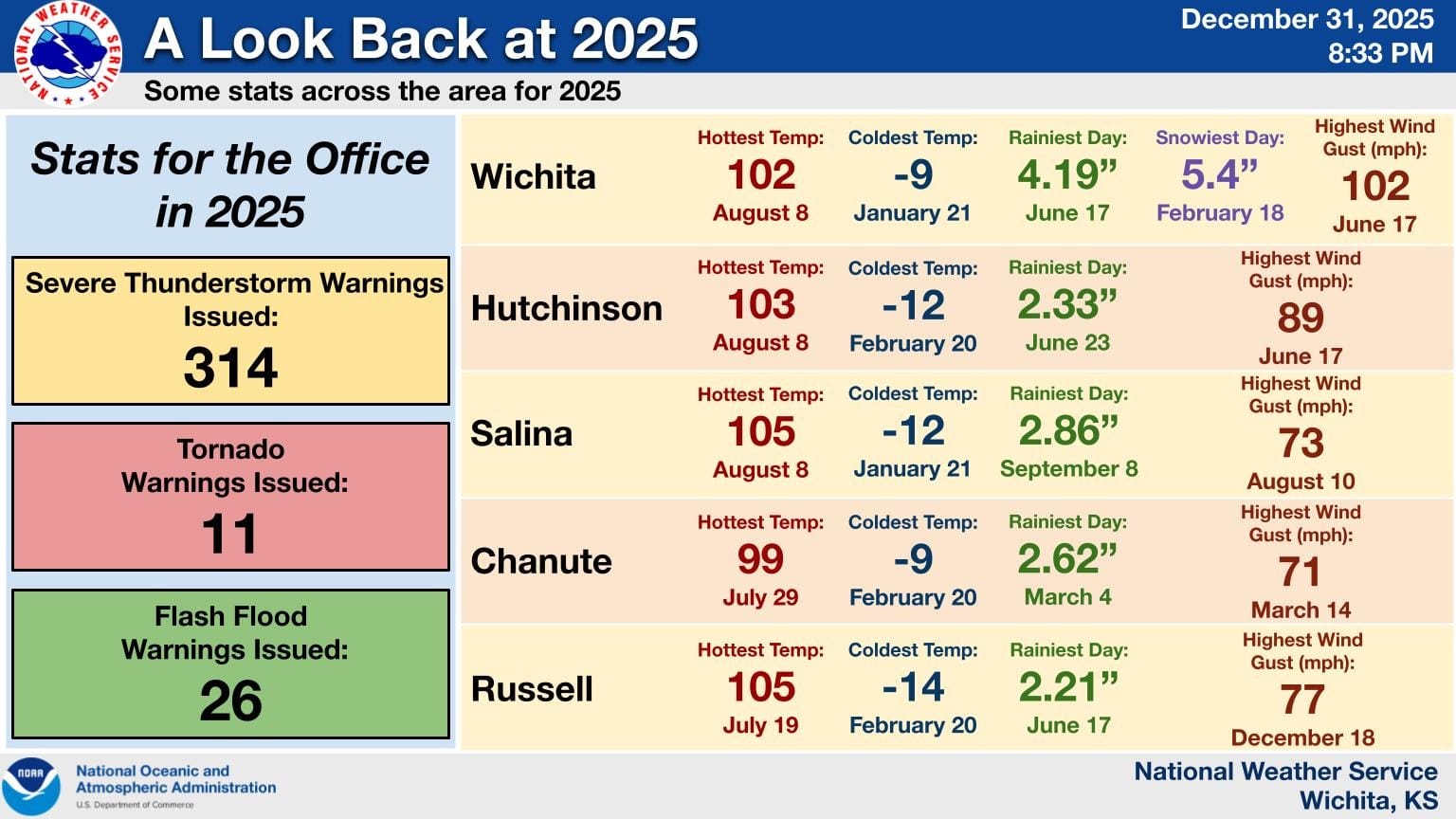 The National Weather Service office in Wichita released its annual weather review for 2025, highlighting a year marked by significant temperature extremes and active severe weather across south-central Kansas. The office issued 314 severe thunderstorm warnings, 11 tornado warnings, and 26 flash flood warnings throughout the year. Wichita recorded its hottest temperature of 102 degrees on August 8 and coldest reading of -9 degrees on January 21, while a June 17 storm system produced both the year's highest rainfall total of 4.19 inches and a 102 mph wind gust, the strongest recorded in the area. Regional statistics show Hutchinson reached 103 degrees on August 8 before dropping to -12 degrees on February 20, while Russell experienced the coldest temperature in the coverage area at -14 degrees on February 20 after reaching 105 degrees on July 19. The data reflects Kansas's characteristic weather variability and the continued importance of severe weather preparedness across the state.