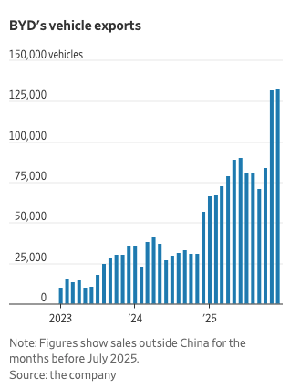 BYD delivered more than one million vehicles outside China in 2025—double the previous year's total—as Chinese automakers exceeded expectations in their global export push, competing against established manufacturers including Volkswagen, Toyota, BMW, and Porsche. China surpassed Japan in 2023 as the world's top auto exporter and shipped 7.1 million vehicles last year, up from 5.9 million the previous year, according to the China Association of Automobile Manufacturers. The Shenzhen-based BYD, which replaced Tesla as the world's largest electric vehicle seller and ranks among Beijing's national champions, is leading Chinese brands that now hold roughly 7% of Western Europe's total auto market after selling more than 500,000 units in the first three quarters of 2025. The rapid expansion marks a dramatic shift in the global automotive landscape, where Chinese manufacturers have moved from being dismissed as unlikely competitors to establishing a significant presence in markets traditionally dominated by Japanese, German, and American brands.
