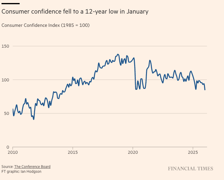 American consumer confidence collapsed to its weakest level in more than a decade in January, falling below pandemic-era lows and raising concerns about the health of the world's largest economy. The Conference Board's consumer confidence index dropped to 84.5, well below market expectations and the lowest reading since May 2014, with consumers expressing deepening concerns about both current conditions and future expectations, according to the think tank's chief economist Dana Peterson. The bleak consumer sentiment despite recent strong GDP growth and spending data has intensified concerns that economic gains are not being evenly distributed across the population, coinciding with President Trump's Iowa visit to begin a weekly tour promoting his economic record as polling shows mixed voter perception of economic conditions.