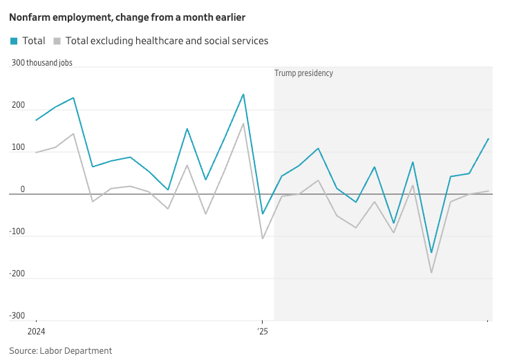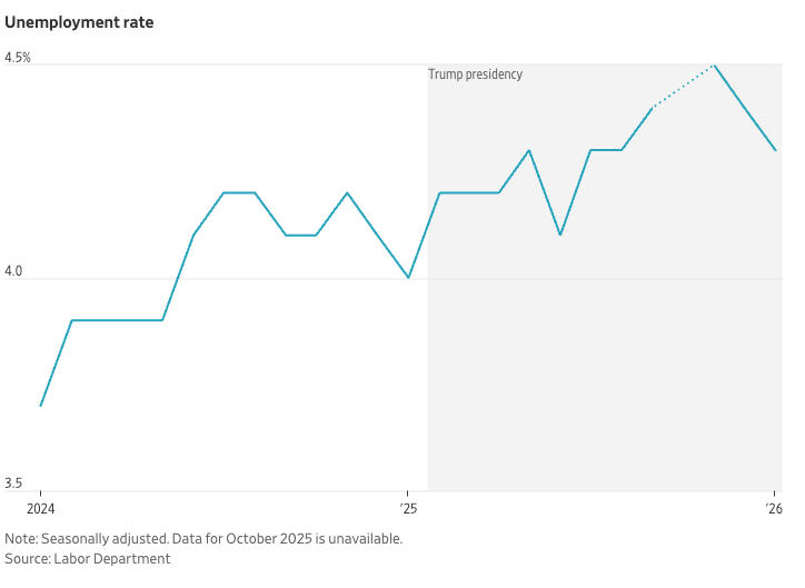 Despite the sharp hiring slowdown, the unemployment rate remained historically low, topping out at 4.5% in November before settling at 4.3% last month — a departure from the typical pattern in which falling job creation drives unemployment higher.