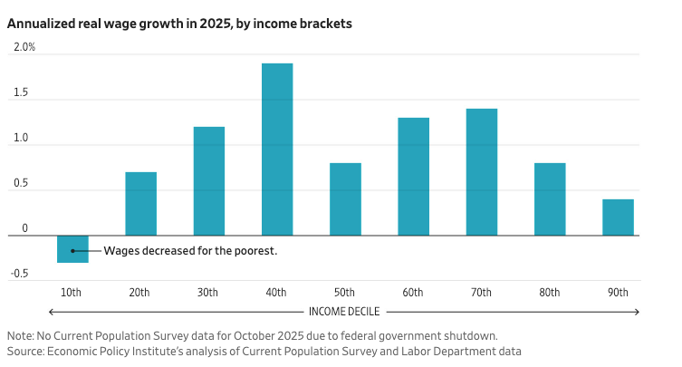 Real wages rose slightly faster in the 12 months ending in January than in the prior year, helping sustain consumer spending. However, Americans with the lowest incomes saw real wages fall in 2025, according to a study from the Economic Policy Institute — a phenomenon economists describe as a K-shaped economy in which wealthier households surge ahead while the poorest fall behind.