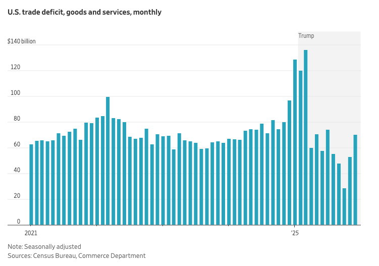 The monthly trade deficit surged to record levels in early 2025 as companies rushed to stockpile imported goods ahead of anticipated tariffs, but fell to a sustained lower level after the levies took effect — settling back near pre-2025 norms through the end of the year.
