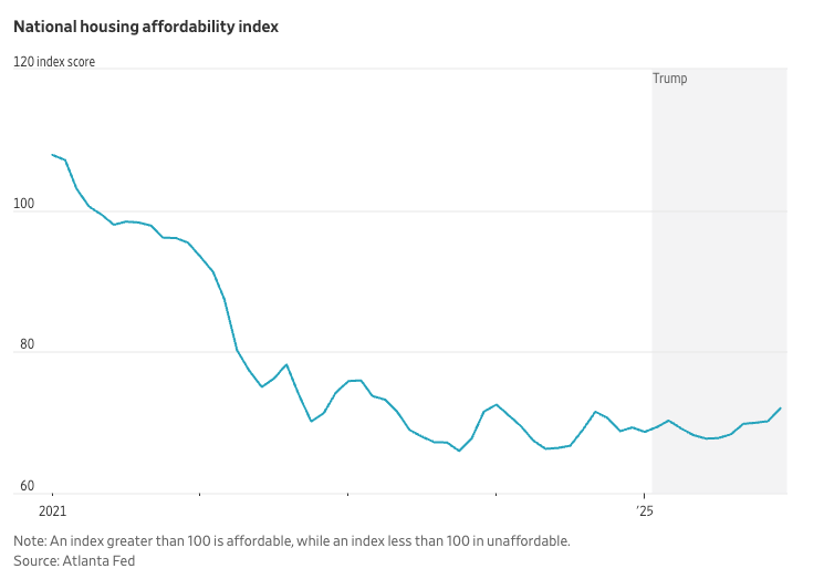 A median-income household seeking a median-price home must now devote 42% of its monthly earnings to mortgage payments, taxes, and insurance — slightly improved from 44% in January 2025 but still elevated. Mortgage rates remain far above early-2022 levels, home prices have held firm, and rents, while easing in some Sunbelt cities, remain well above pre-pandemic norms.