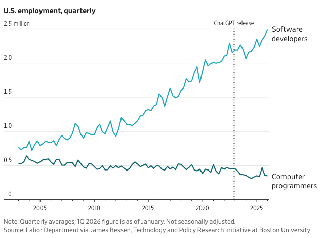 The mass layoff landed the same week a viral report positing widespread AI-driven job destruction triggered a broad stock market selloff, pushing AI disruption fears into the mainstream. But some economists argue the doomsday scenario lacks supporting evidence. Labor Department data analyzed by James Bessen of Boston University shows software developer employment rose 5% year-over-year in January, consistent with two decades of growth, while business software spending jumped 11% in the fourth quarter — suggesting that as AI reduces costs, demand for technology workers may actually increase. Historically, technological advancement has displaced some jobs while creating new ones through enhanced worker productivity, new businesses and lower consumer prices, a pattern that has not produced sustained economy-wide unemployment in the United States.