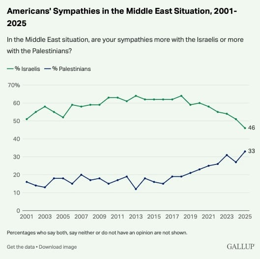 B. WASHINGTON, D.C. – Although Americans remain more likely to say their sympathies in the Middle East situation are with the Israelis rather than the Palestinians, the 46% expressing support for Israel is the lowest in 25 years of Gallup’s annual tracking of this measure on its World Affairs survey. The previous 51% low point in this trend of Americans’ sympathy for Israelis was recorded both last year and in 2001. At the same time, the 33% of U.S. adults who now say they sympathize with the Palestinians is up six percentage points from last year and the highest reading by two points.