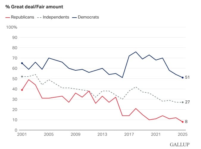 Partisan trust levels in the mass media are at or near record lows among all party groups: 8% of Republicans, 27% of independents, and 51% of Democrats express a great deal or fair amount of confidence in media reporting.
